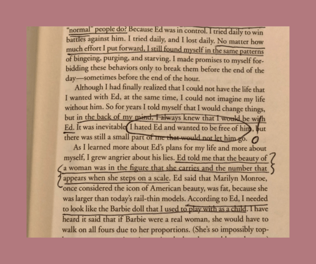 The first few pages in and it was perfectly clear ED was not a jerk ex that had caused chaos in this woman’s life. ED was her eating disorder – anorexia – that she cleverly named ED.